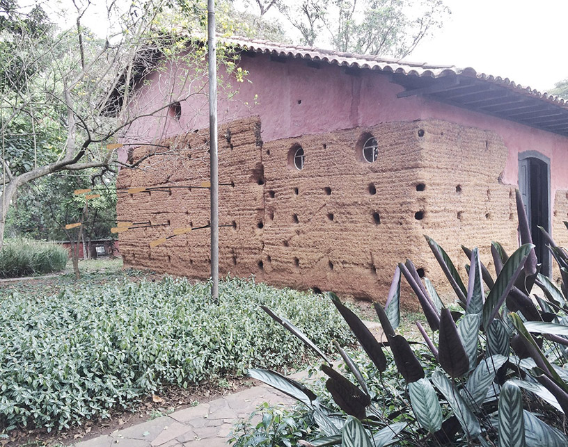 A artista realizou uma imersão em uma olaria no interior paulista para desenvolver as peças de argila que compõem o trabalho. Durante o processo, testou deformações em blocos cerâmicos industriais, batendo-os contra a parede até que perdessem as arestas e ganhassem forma cilíndrica, próxima à dos vazios da taipa. O gesto, quase performático, é tanto físico quanto simbólico: um embate entre corpo e matéria que evidencia a resistência do material e a dimensão experimental de sua prática.